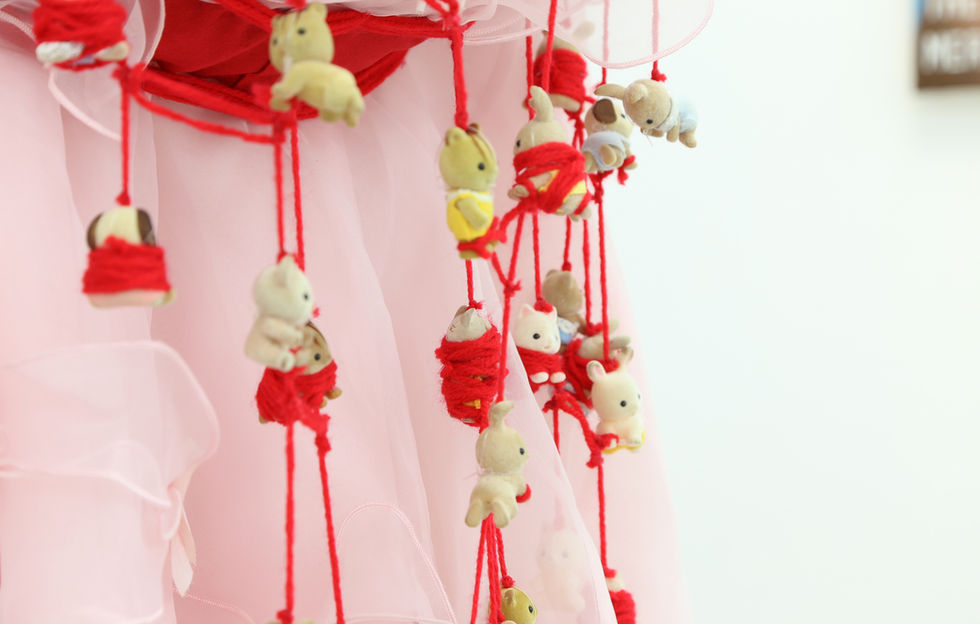 4. 妊娠したウェディングドレスの上に女児向けの動物型ドールで家系図を描いた《Family tree based on exploitation of female bodies》は、家父長制での結婚がこの価値観に続いている入り口であることを表現している