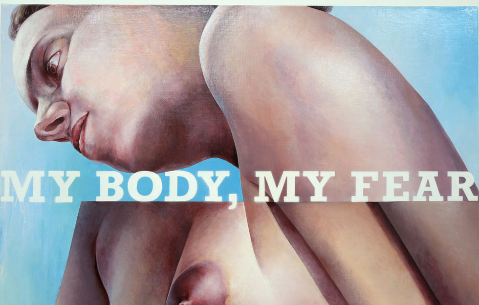 いかに日本の妊産婦死亡率が低くとも、今でも日本で年間30~40人が命を落とすほど※3、出産には身体的リスクが伴う。そんな「妊婦の身体」に掛かる身体的負荷のうち、視覚化されるものとして妊娠線がある。妊娠線は妊娠によって腹部が急激に大きくなっていくことで真皮に亀裂(所謂「肉割れ」)が生じたものだが、マタニティフォトのような妊婦のモデル写真にはその様子が写ることはほとんどない。妊婦の身体の視覚的理想化が進むあまり現実との乖離が大きく生じており、出産経験者やそのすぐ近くにいた人でない限りその存在は認知されにくい。「MY BODY, MY FEAR」と描かれている《Things against oppressors》や、妊娠線の出ている腹部を描いた上にマーガレット・アトウッドを引用したフレーズを記した作品群は、いずれもこのように不可視化された身体負荷を可視化させる作品である。