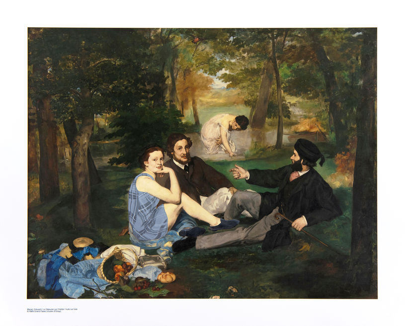 みょうじなまえは本展でミュージアムショップを模したインスタレーション《OUR BODIES》を展開する。これは商品が流通していく通過点としてのミュージアムショップと、それを通して消費者の手元に製品が普及していくまでが作品である。《OUR BODIES》では、エドゥアール・マネ《草上の昼食》、ギュスターヴ・クールベ《世界の起源》、アンリ・マティス《ダンスⅠ》に服が加筆されたイメージを基に制作された、ポスターやポストカード、マグカップ、トートバッグなどのグッズが陳列され、これらのグッズは実際に購入することも可能である。ゲリラ・ガールズが「女性がメトロポリタン美術館に入るためには裸にならなければならないのか?」と問いかけたように、アートシーンに女性アーティストは少ないが、男性アーティストが描いた裸の女性像は多数存在する(1989年のゲリラ・ガールズの作品では、メトロポリタン美術館の近代美術部門のうち女性アーティストは5%未満であるにも拘わらず、裸体像の85%が女体であることが指摘されている)。これは決して女性の身体が普遍的な美を持っているからではなく、歴史的に制作者と評価者の中心が男性であり、女性や女性の身体が彼らによって客体化・対象化されてきたことの結果だろう。みょうじの試みは、このような近代以前の価値観から女性たちにとっての「Our bodies(=私たちの身体)」を取り戻すことであるといえる※2。